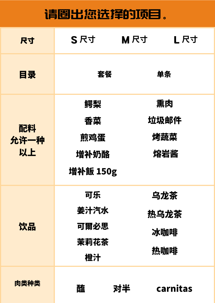 订购时,请在桌上写下纸张。 下面是您所选语言的示例。 请以此为参考,写下您的订单并交给工作人员。
