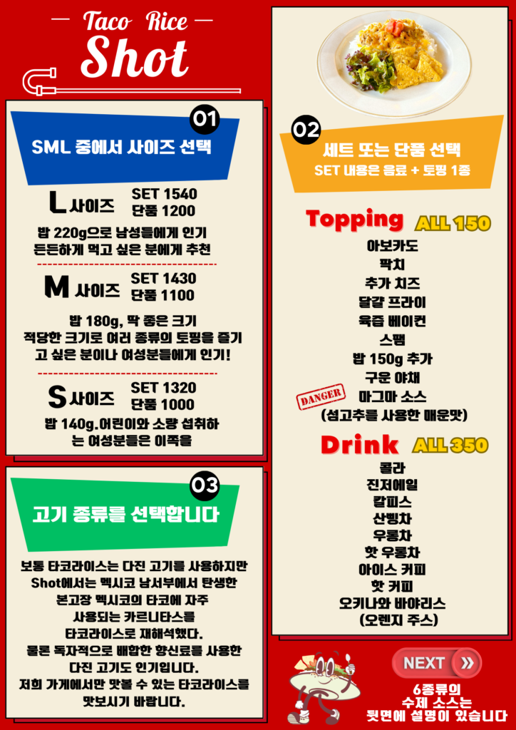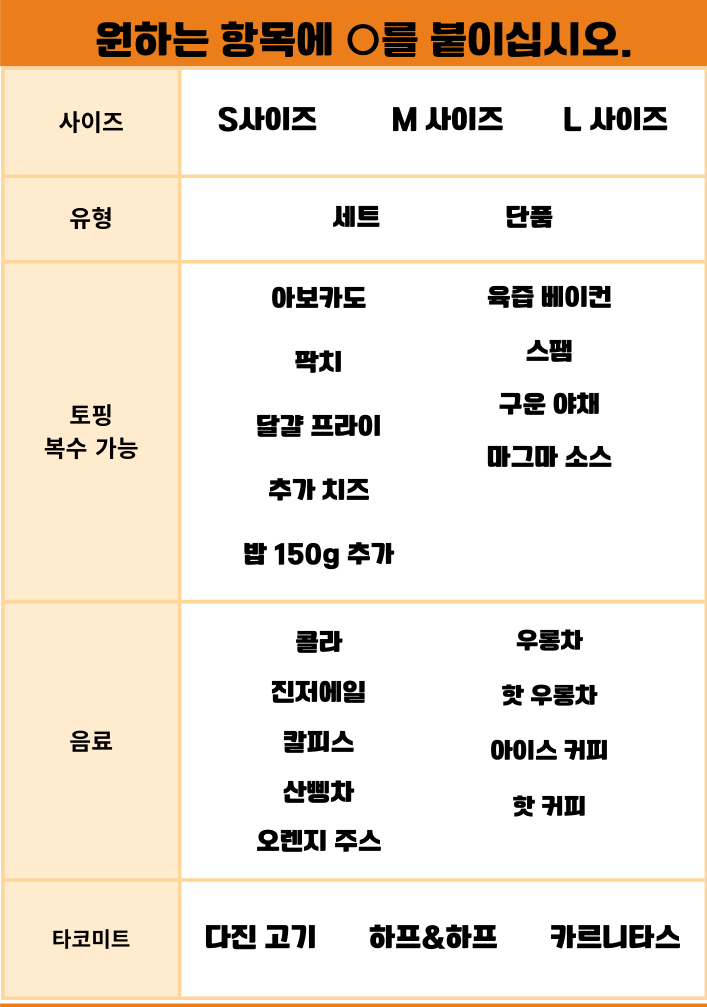 주문은 테이블에 있는 종이에 적어주세요. 선택한 언어의 샘플이 아래에 있습니다. 참고하여 주문서를 작성하고 직원에게 전달해 주세요.