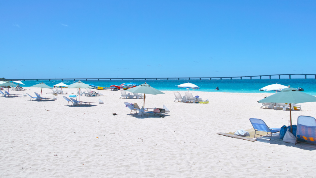 宮古島を代表する絶景ビーチです。白い砂浜がどこまでも続き、海は透き通るエメラルドブルー。まるで絵画の中に入ったような景色です。